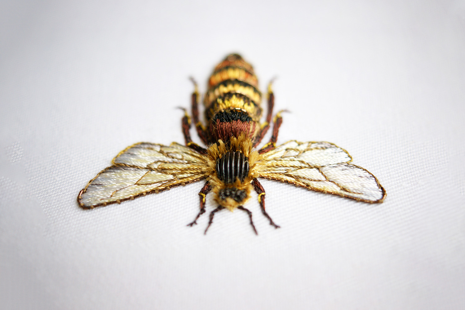 This is a close-up view of a framed queen honey bee that was designed and created with sculptural techniques for a three-dimensional effect. The bee was embroidered with a mixture of silk shading, goldwork and raised work techniques.