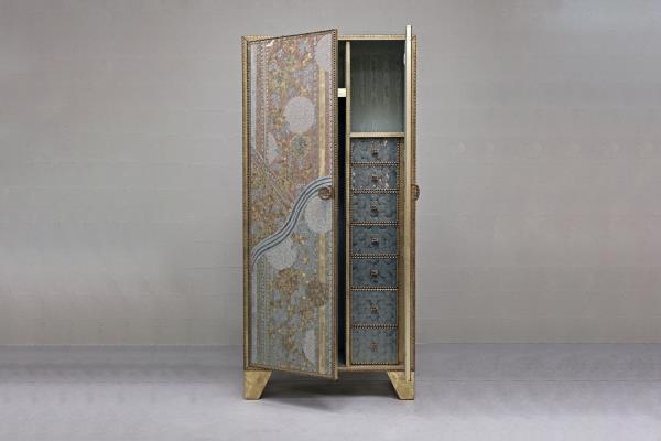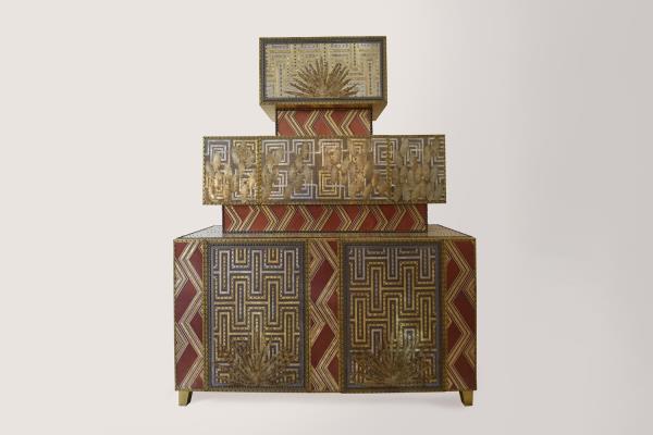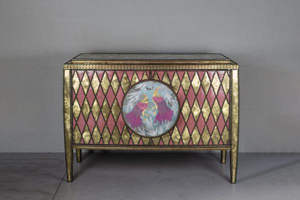 Reminiscent of the Art Deco style, this big chandelier from the Parlami d'Amore collection is revisited through industrial influences that make it a contemporary work of art. The decorations are made of clear glass strokes, crystals, brass disks, fibreglass and gold leaf fringes.