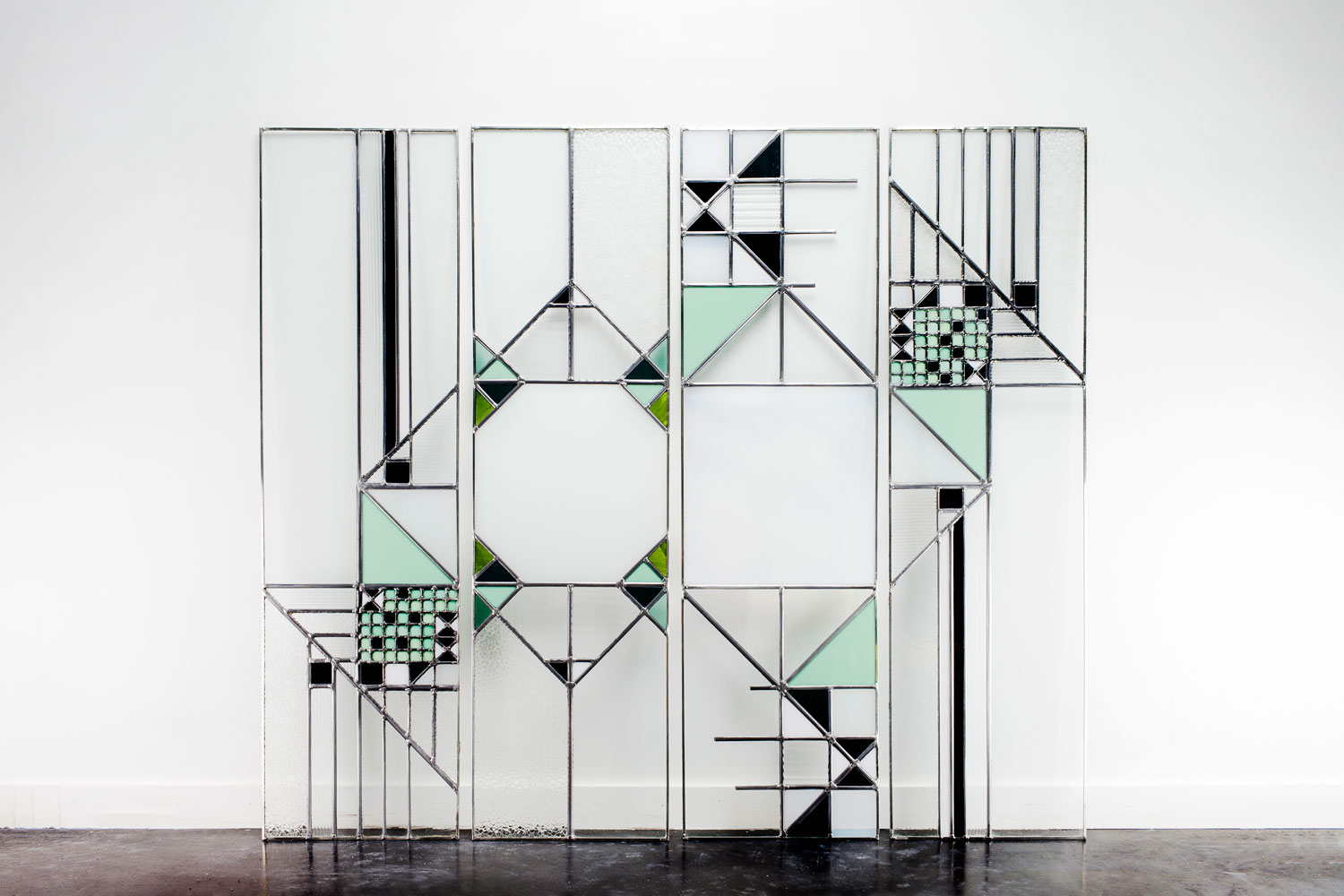 These are actually four panels that were designed for two wooden interior doors in a corridor of a mansion, but here they are photographed as one composition. The dominant colour is mint green, because this is the client's favourite colour. The design is inspired by a tile motif in this house.