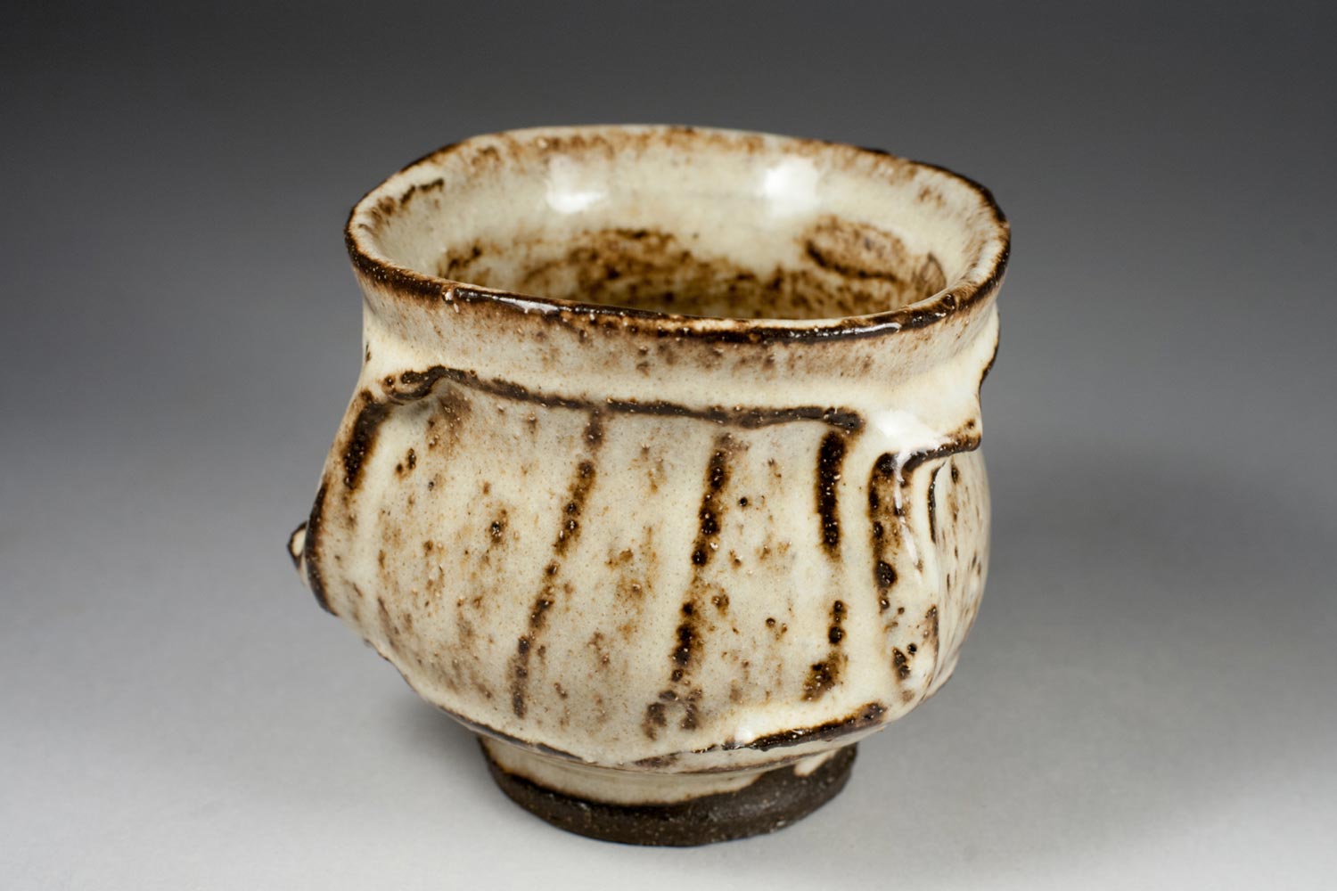 The Delta cup's foundation is black clay. It is unevenly covered in white glaze. The object is made with a special Delta technique on a potter's wheel. It is created using electric firing.