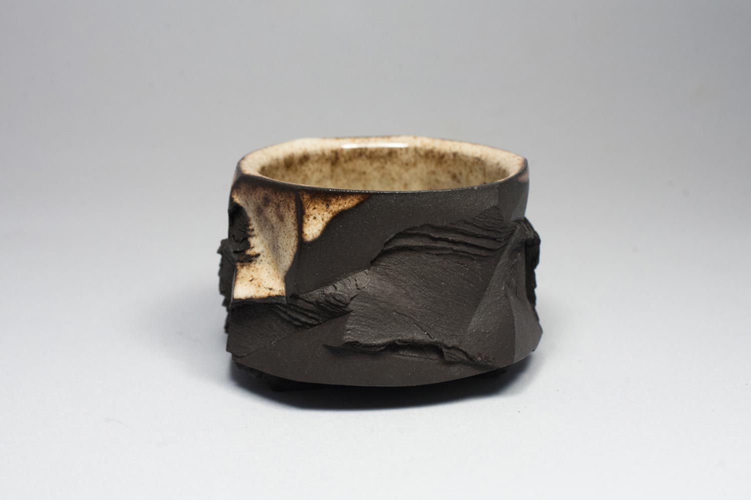 This cup is made of black clay with parts covered in white glaze. The object is created using the special Discovery technique following the electric firing process.