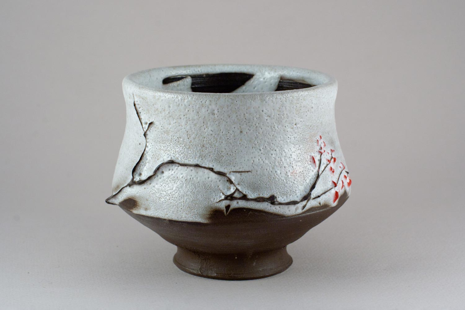 This cup is made of black clay on the potter's wheel using the special Early Spring technique. It has a stylized branch drawing with flowers in bloom. It is created using electric firing.