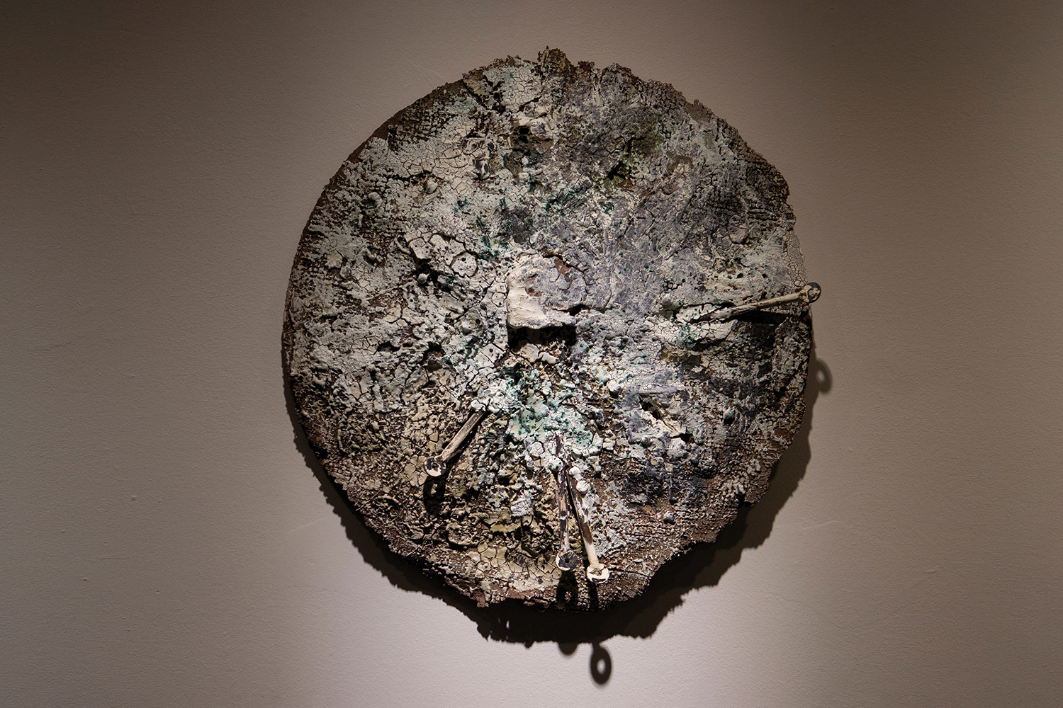 This bas-relief from the Delamination series is handmade from brown fire clay mixed with coffee beans, covered with porcelain and crawling glaze. Steel rods are embedded in the glaze. The whole object is fired multiple times.