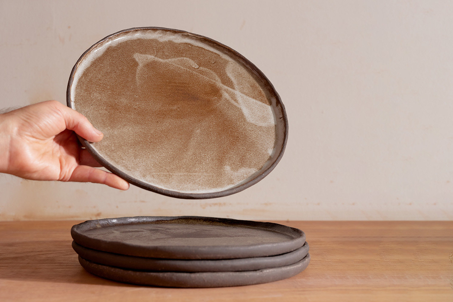 Handcrafted in black stoneware, this modern flat dinner plate has an almond glaze on the inside and a highly textured, rust unglazed rim and underside. It is perfect for large meals, dinners, Sunday roasts or serving dishes.