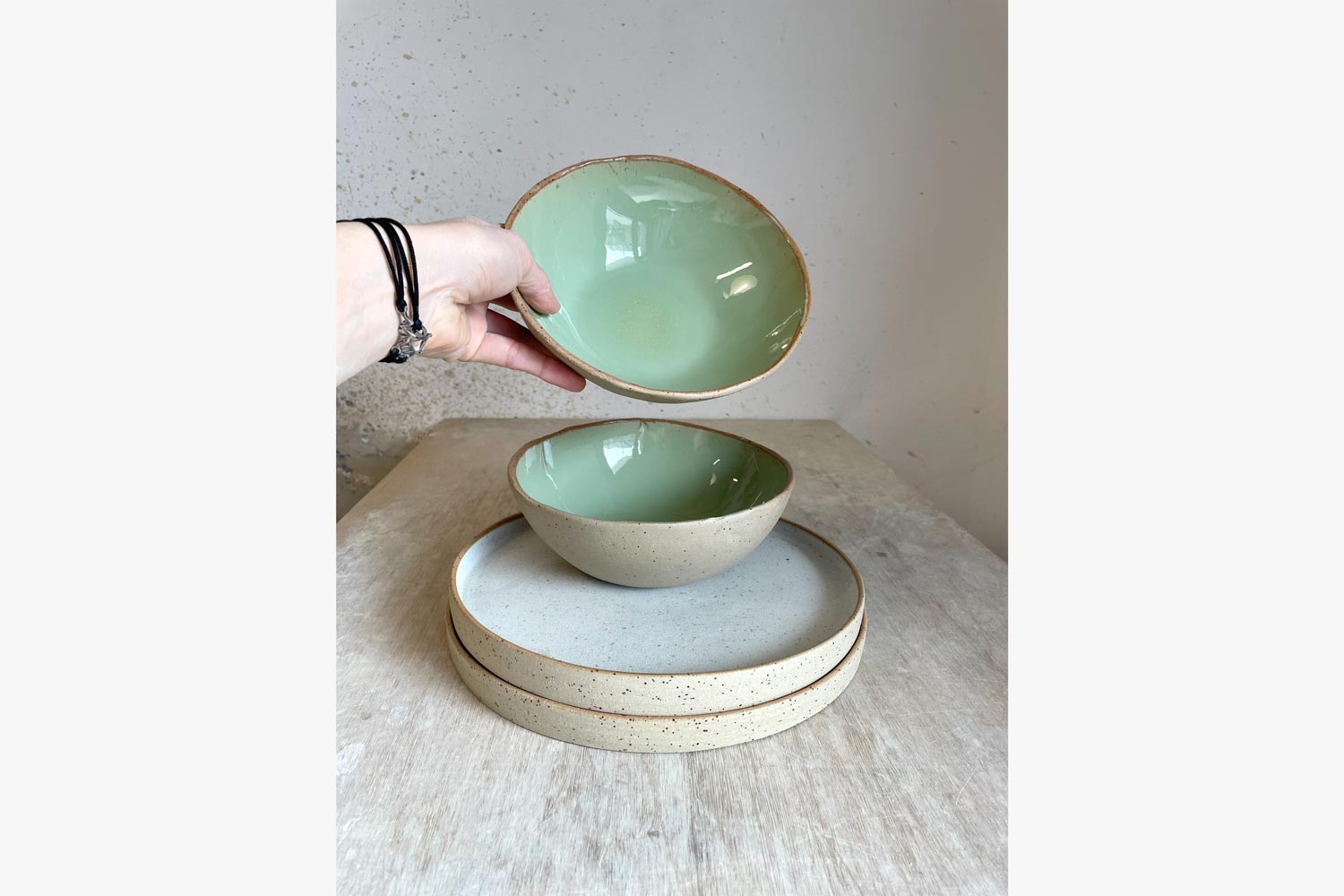 Daša made a set of two bowls from stoneware clay and glazed them with a food safe glaze. They can be used for serving soup or small portions of risotto. She gave them a distinct character with a combination of glossy sand colour on the outside and a pistachio green on the inside.