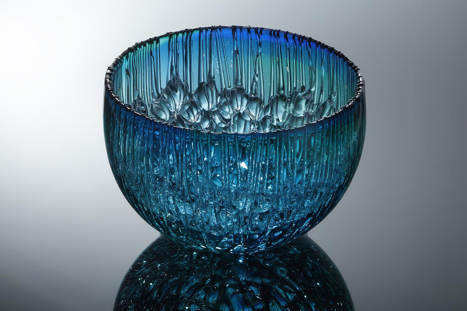 Cassito reflects Katherine Huskie's passion for adding textures to blown forms. The bowl form is blown in a mix of blue and green. Once the bowl is made, the craftswoman then adds individual drips of molten glass to the inside to build her undulating pattern.