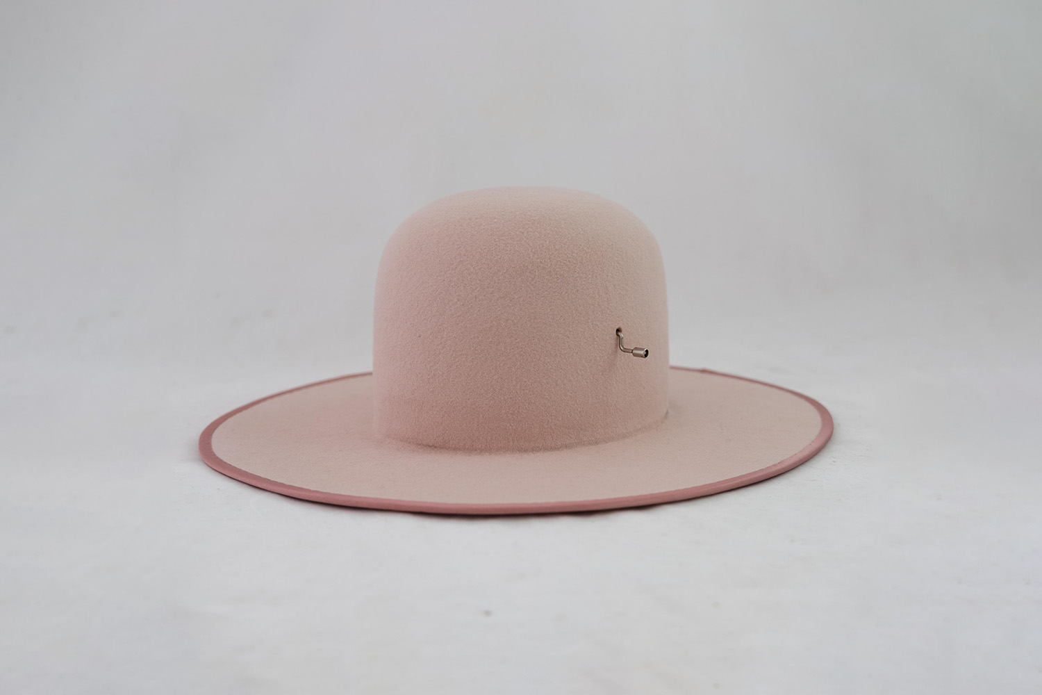 This handmade hat has a music box sealed inside it, that plays Mozart's 'Eine Kleine Nachtmusik'. A small handle is placed in the crown of the hat to be turned just like a dancing ballerina in a music box. The pink felt is decorated with a satin brim and lining, a hint to ballerina shoes.