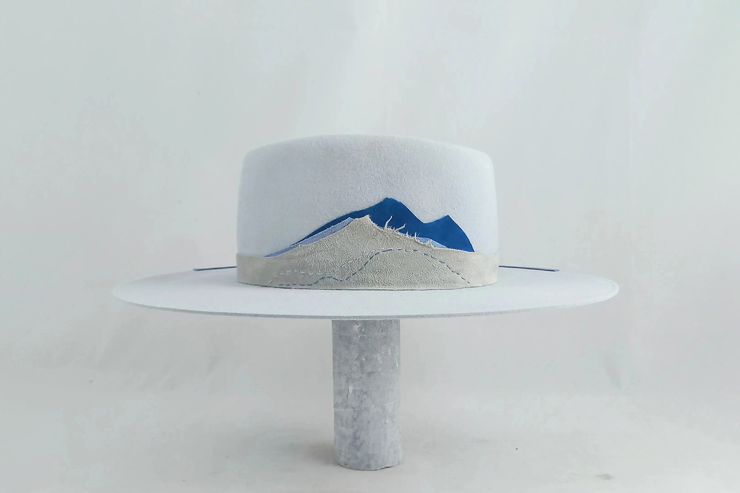 This fur felt hat was shaped entirely by hand in light blue. Like a painting on a canvas the crown and body of the hat shows the scene of a mountain with a small lake, a couple of trees and a bird embroidered by hand. The interior has a leather ribbon and satin lining.