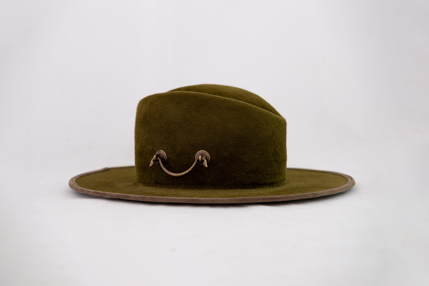 Tribute to Nancy Sinatra's 1966 song, this hat shaped entirely by hand features two handles to suggest the playful idea that hats are also taken on walks. Made in forest green in melusine, the rim is reinforced with a green velvet ribbon. The interior is lined with black satin and a leather ribbon with a little pocket to place a coin if needed on the walk.