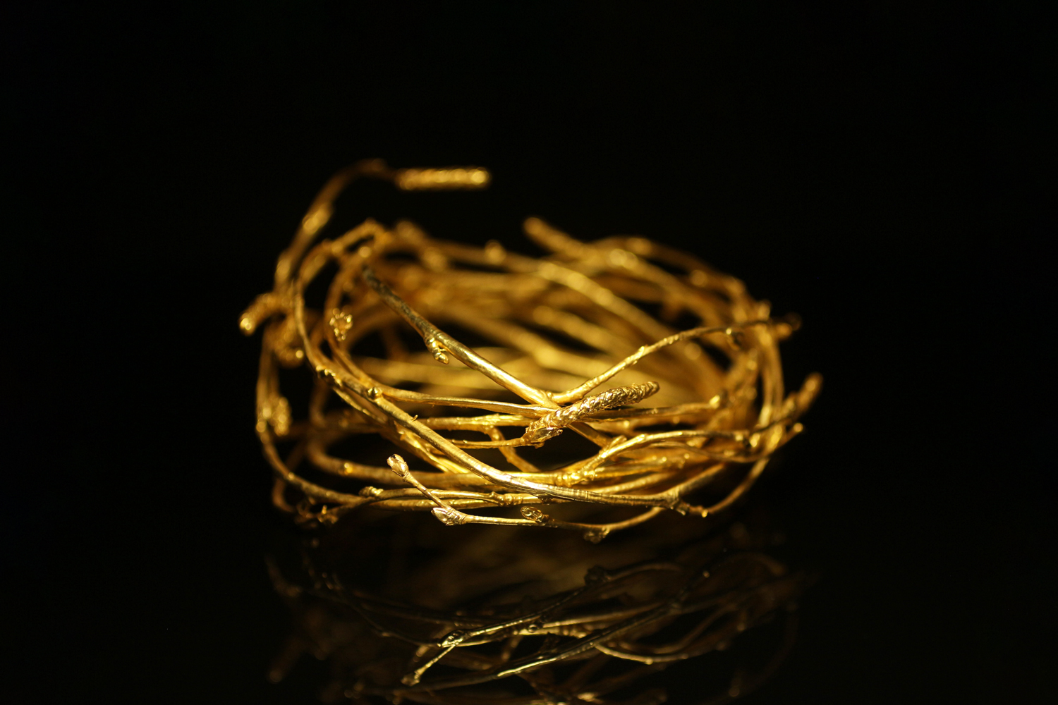 A complex bracelet consisting of intertwined birch branches in gold. Not only the buds are reproduced, but also the pattern of the tree bark. Thanks to the combination of matte and polished gold, the jewellery has a very voluminous look.