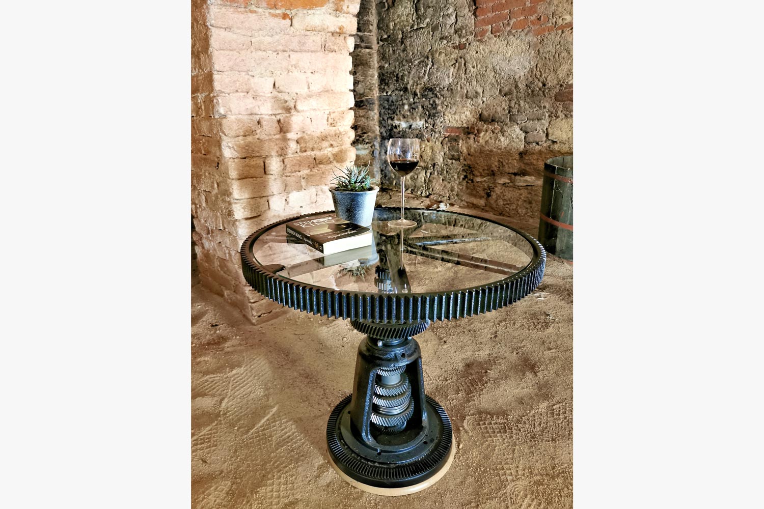 The table is made of various machine spare parts that Aleš found in his workshop. The moving parts in the middle of the table are gears from the car's gearbox. All parts are sandblasted and powder-coated in matte black. The table top is made of a large cast iron sprocket and glass.