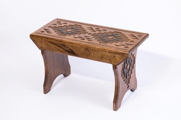 Ermin Ljevo made this chair, a traditional Bosnian souvenir, respecting typical dimensions and decorations. It can be made in different dimensions and carvings of the customer's choice, decorated according to the Bosnian traditional pattern or woodcut.
