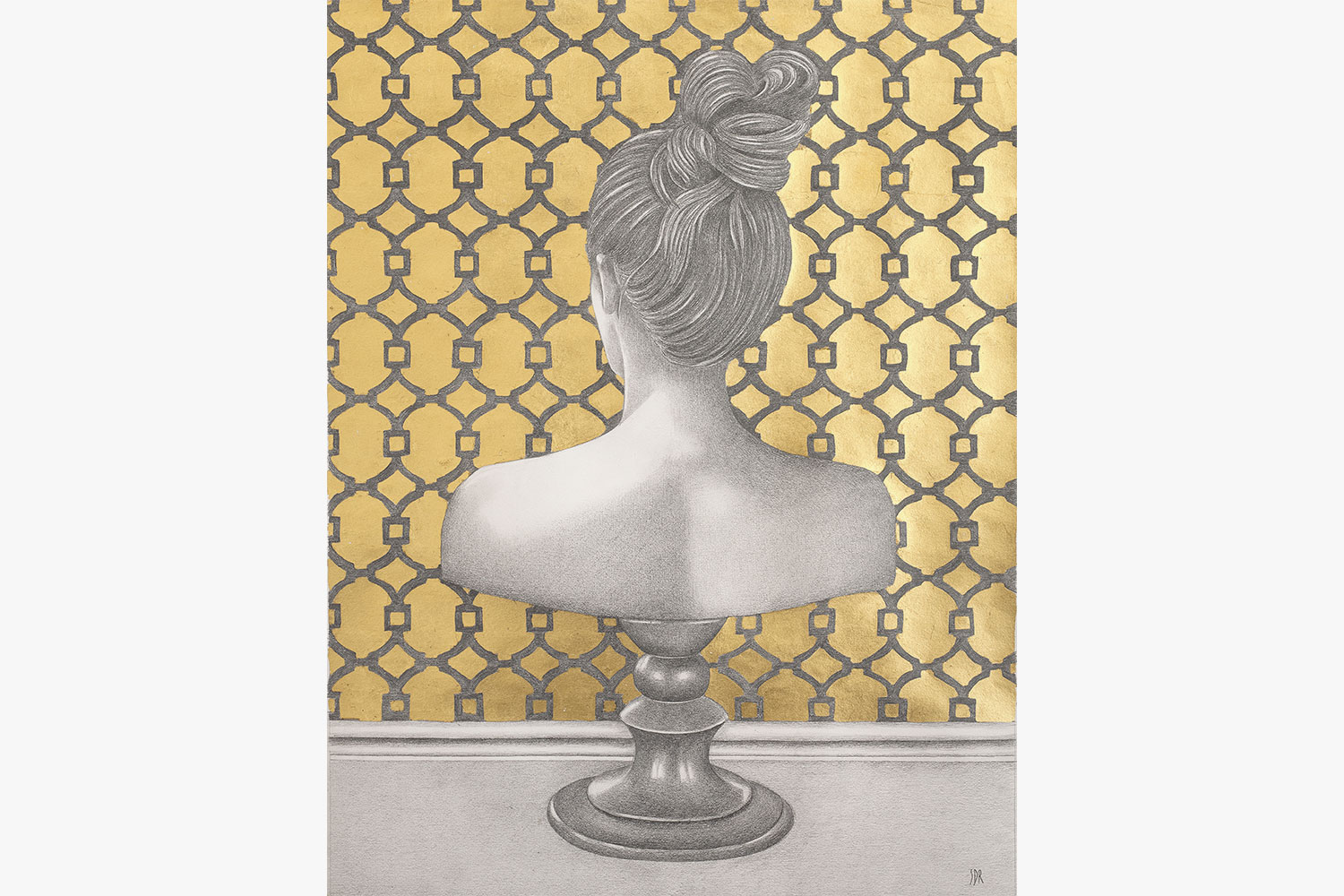 This drawing, made with graphite and pure gold leaf on paper, shows a female bust on a pedestal, seen from the back. The title of the work is a reference to the art of restoration, where “verso” is the back part of a painting.