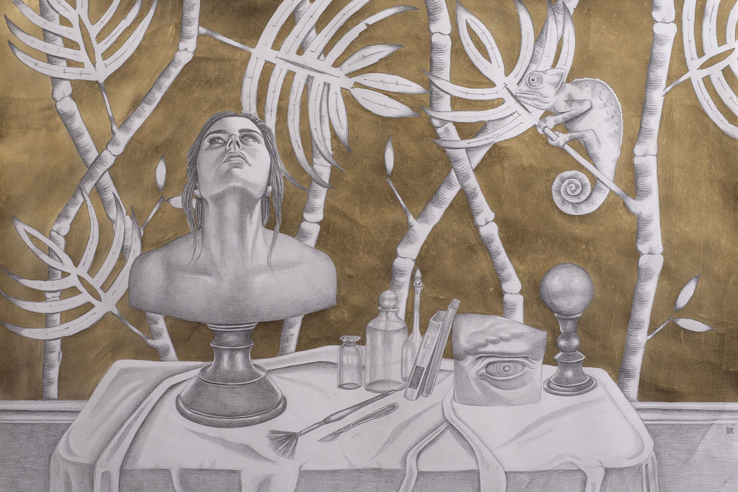 Part of the female portraits series, this drawing is made with graphite and gold leaf on paper. The woman portrayed is a projection of the artist and is meant to investigate the complex relationship between body and soul. As in many other works by Dei Rossi, the main subject stands on a pedestal.