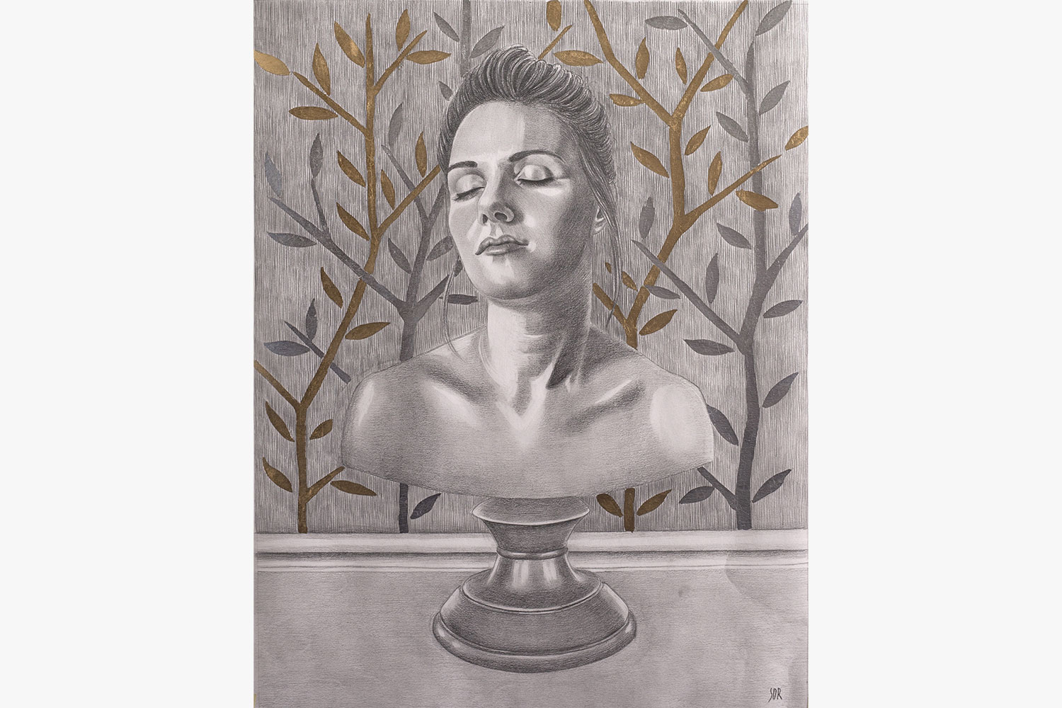 Another drawing from the Female Portraits series, where Stefania Dei Rossi projects herself onto her model. The pedestal's role is crucial as it elevates the figure, supporting and isolating it. The artist used gold leaf and silver for the background.