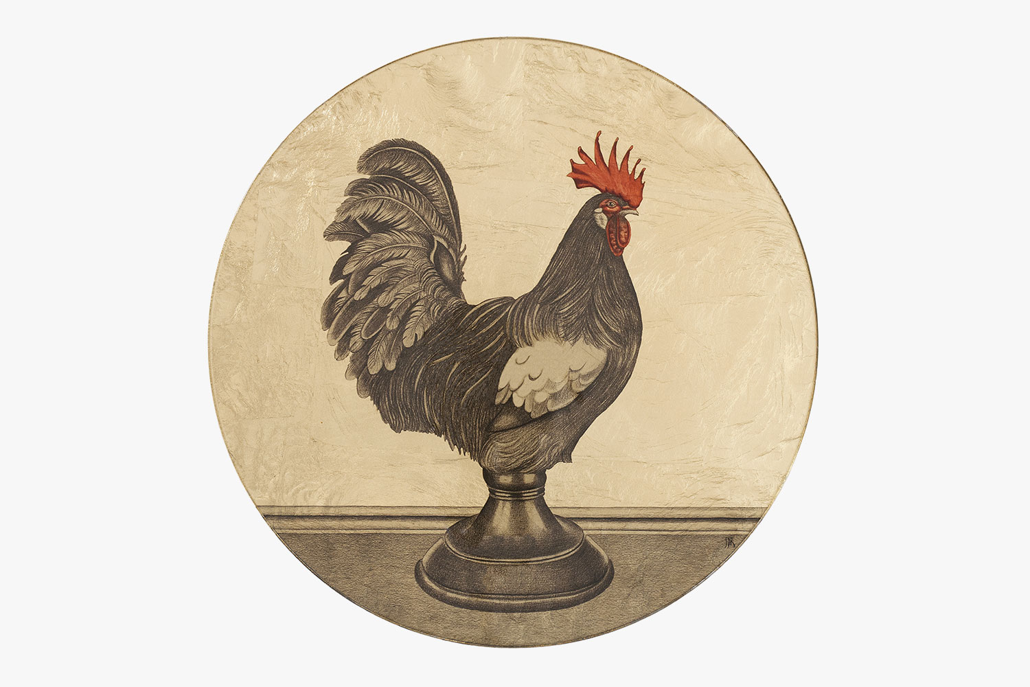 This table placemat is made of tempered glass and decorated with the drawing of a rooster from Stefania Dei Rossi's signature series Animals on pedestals. The golden background, hand gilded with the application of gold leaf, decontextualizes the animal. The placemat can be used for setting the table or as a decorative object to hang on the wall.