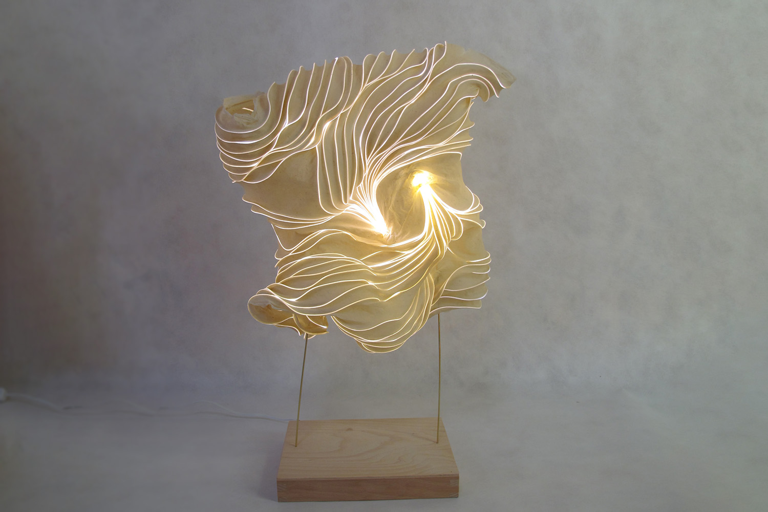 Small light sculpture with opulent shapes, handcrafted from paper of ivory white, white light designs, and remote-controlled white backlight. The sculpture is supported by thin brass tubes and a wooden base.