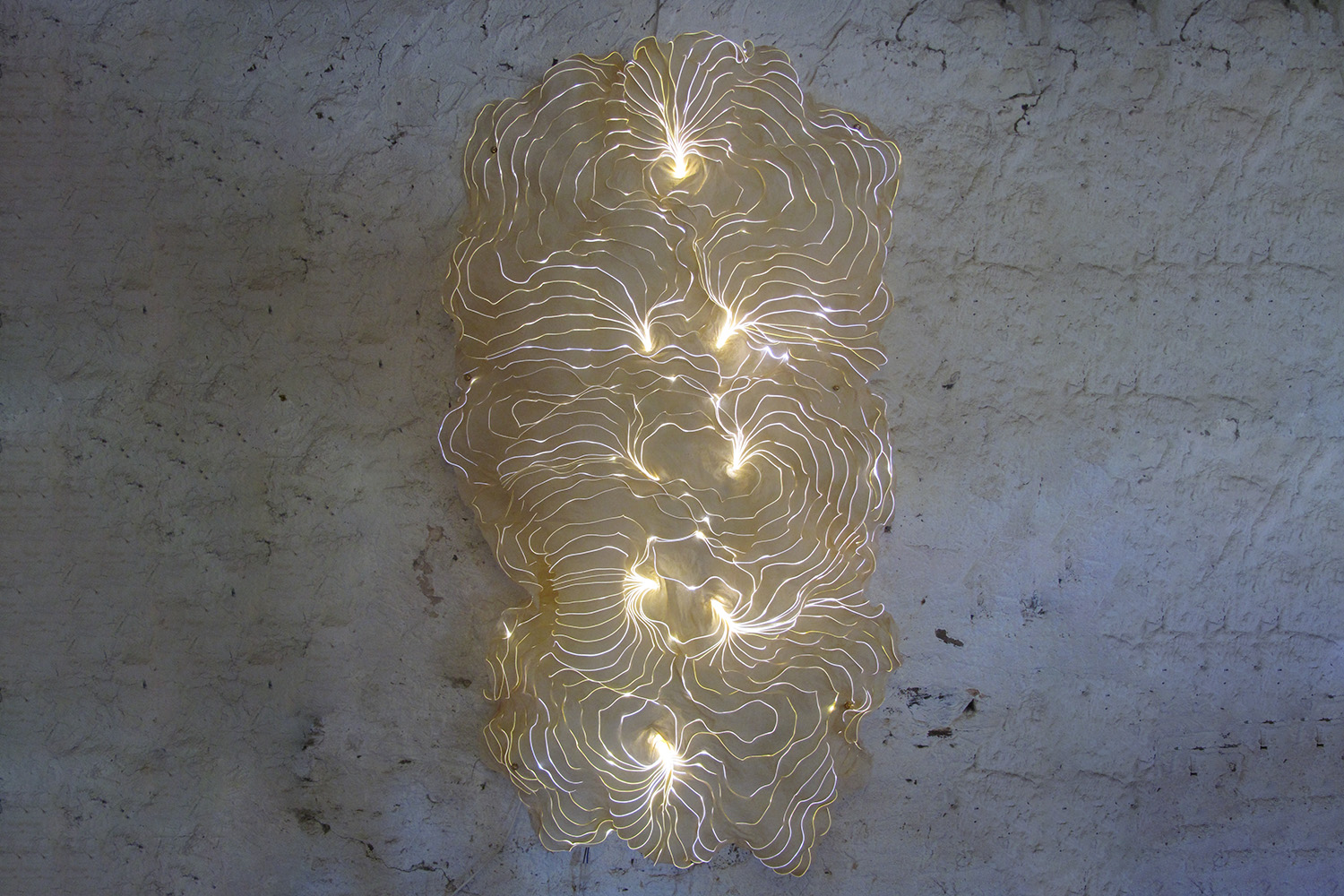 Wall-mounted light sculpture with opulent shapes of handcrafted paper in ivory white, with white light designs, and the option of a remote-controlled animated backlight in various colours.