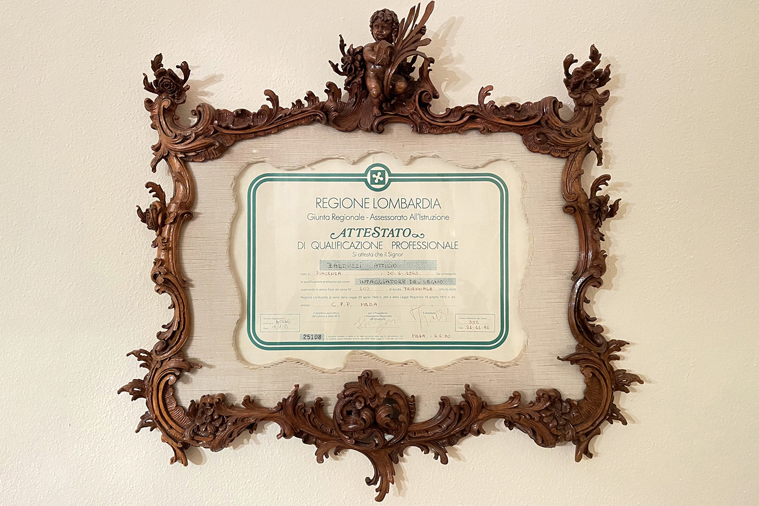 This frame was micro-carved by Attilio Balduzzi: reproducing the rococò style, it's decorated with rocailles. A putto is holding palm branches at the top of the frame, adorned by foliage volutes.