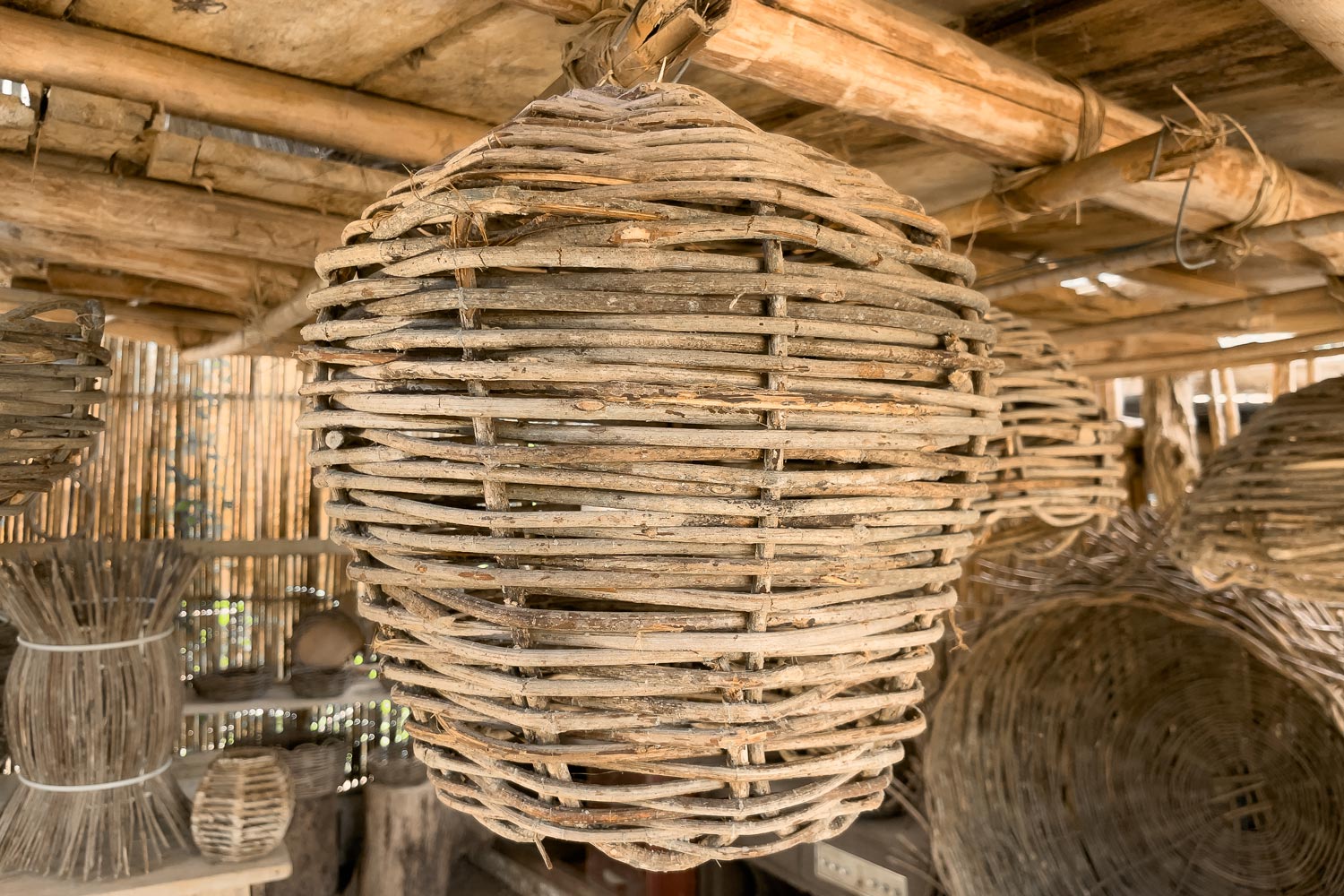 The drop lamp is woven in pedroalejo creeping plant using the radial technique. The piece is naturally coloured, composed of different shades of brown. The upper part has a diameter of 35 cm and the lower part a diameter of 20 cm.