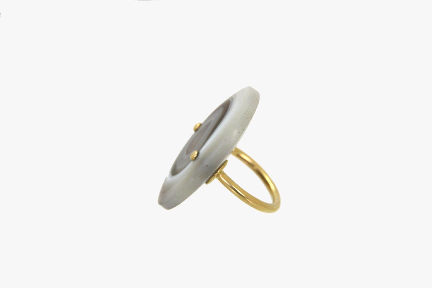 Hand-carved Scottish grey and white banded agate ring with gold band and two gold rivets. The Agate is fastened to the gold band through two holes on the front of the ring which have been riveted with handcrafted gold rivets.