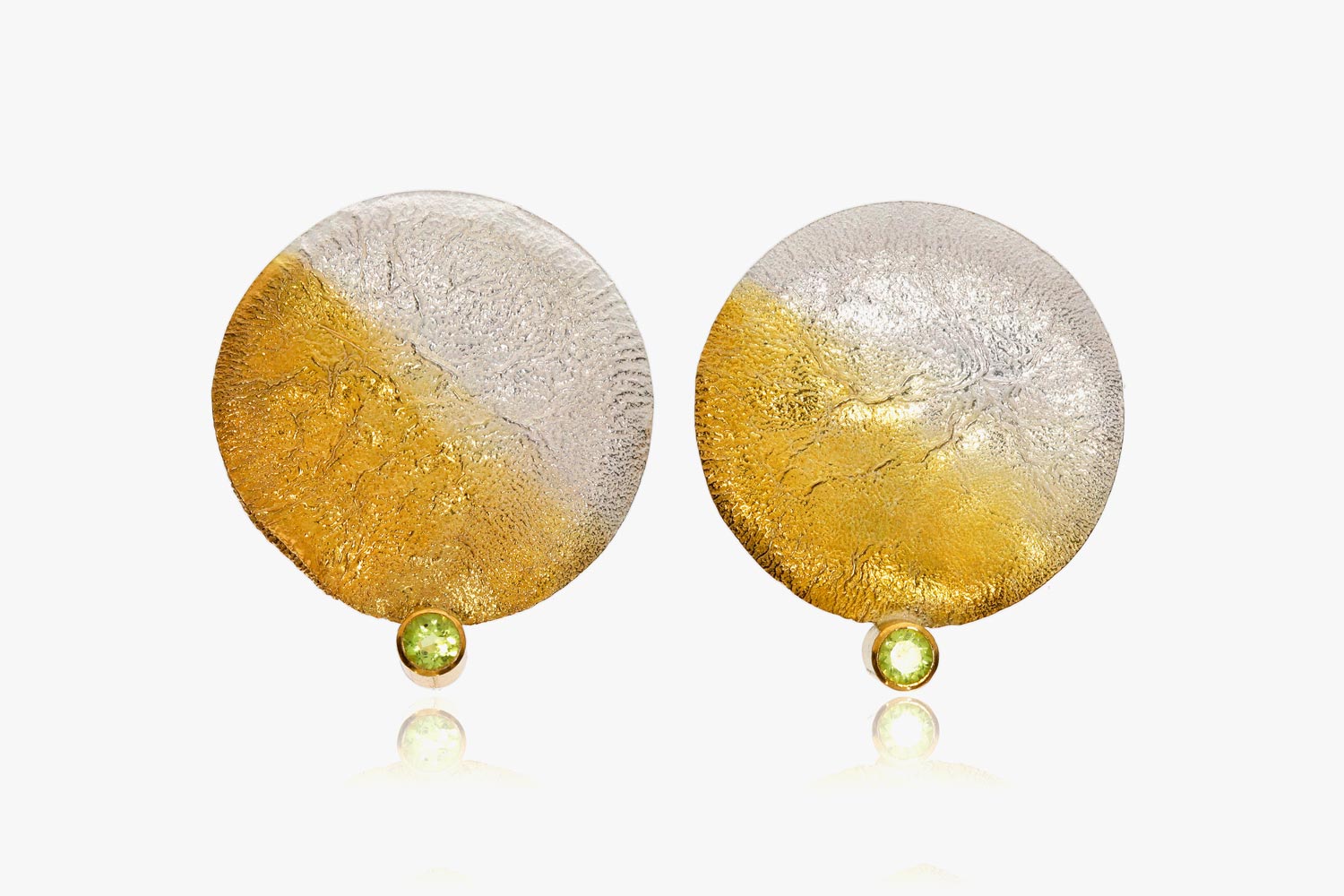One-of-a-kind silver earrings with shiny peridot selectively plated with 18 carat gold. The earrings have a unique texture, obtained by reticulation.