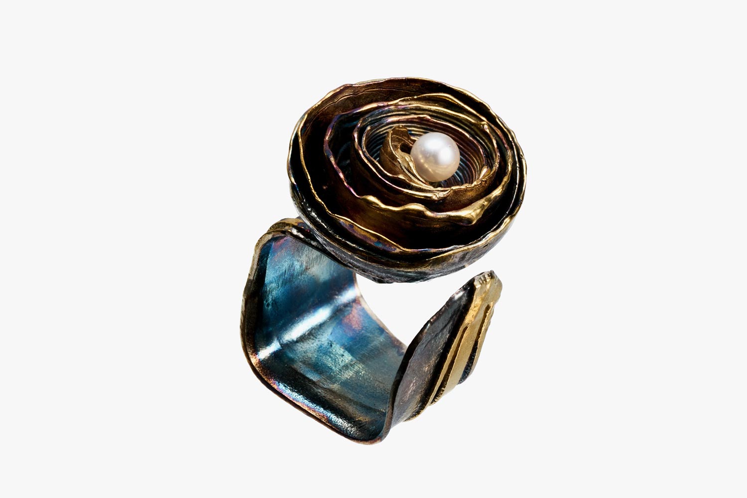This adjustable silver ring is plated with 18 carat gold and a small white natural pearl in the centre. Two traditional techniques were combined to make the ring. The flower was hand carved and cast using the lost wax technique and the ring was created by hand making, fusion and reticulation.