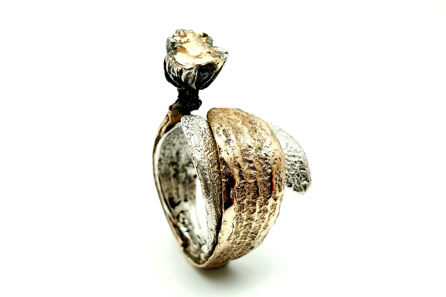 This ring from the Delight collection, 2021 embodies the beauty of imperfection and impermanence, mirrored in a delicate bud emerging from a weaving of leaves that seem to dance around your finger. The natural simplicity of the almost raw silver textures is balanced by bright golden accents. It is entirely handmade using casting and traditional construction techniques.