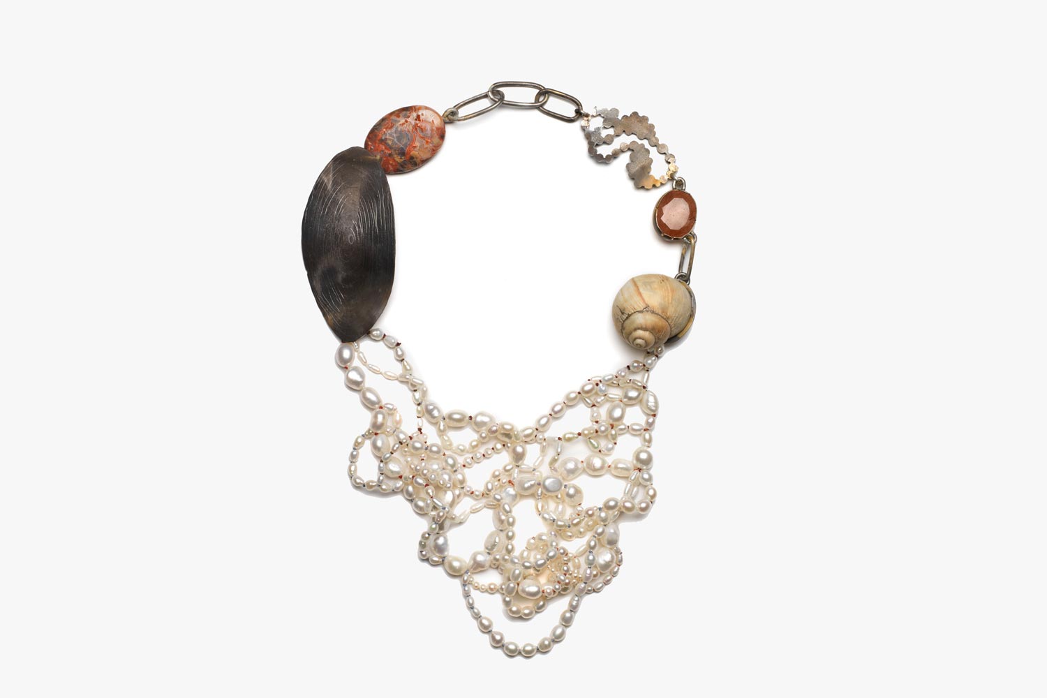 A necklace from the Before/After exhibition. It is comprised of lush freshwater pearl on the lower part and a combination of mixed stones and a snail shell connected by silver on the upper part.