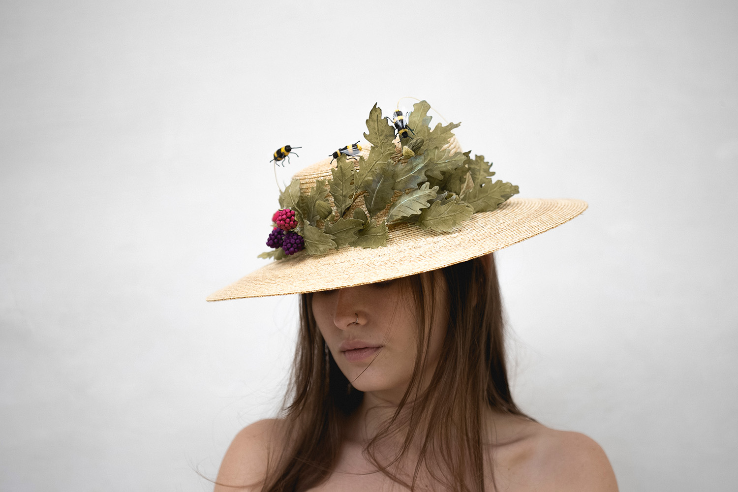 This natural straw hat is decorated with silk oak leaves, acorns, berries and bees in realistic colours. Fruits and leaves are handmade in silk. The bee bodies are handmade in velvet, paws and antennae in wire, and wings in feathers.