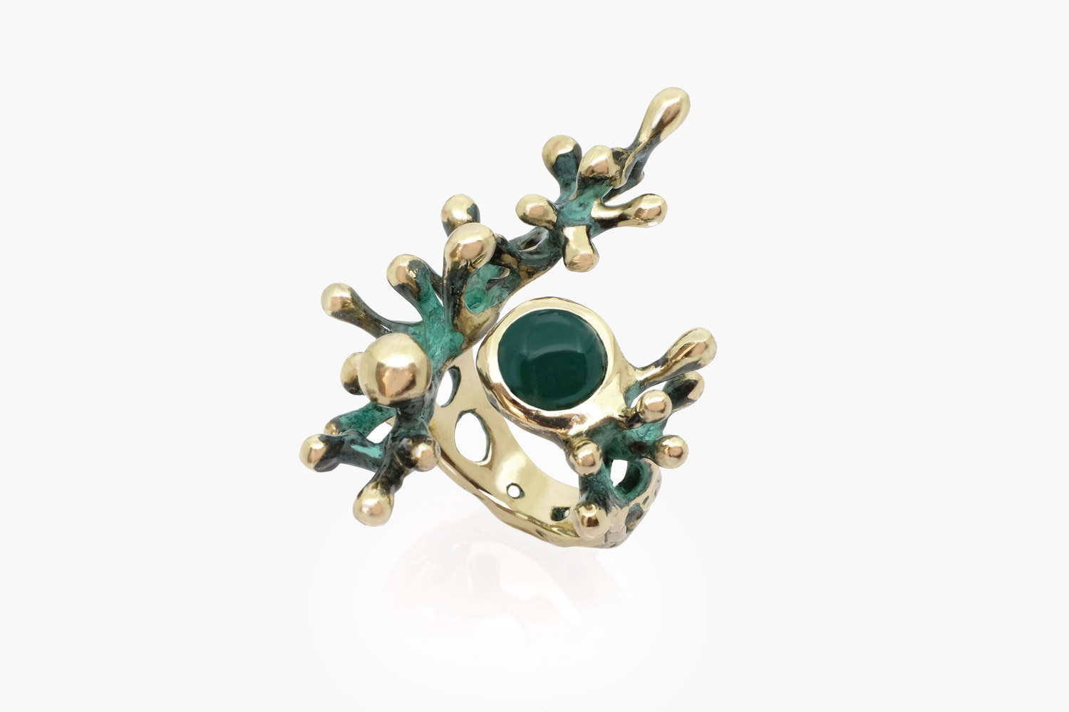 Exclusive ring made of brass with green patina and green agate, entirely designed and handcrafted in Italy by Roberta Risolo with the lost wax micro fusion technique. An “abbraccio” (Italian for hug) is able to make people and communities come closer. The most beautiful words can be expressed through a simple gesture, as primordial as vital.