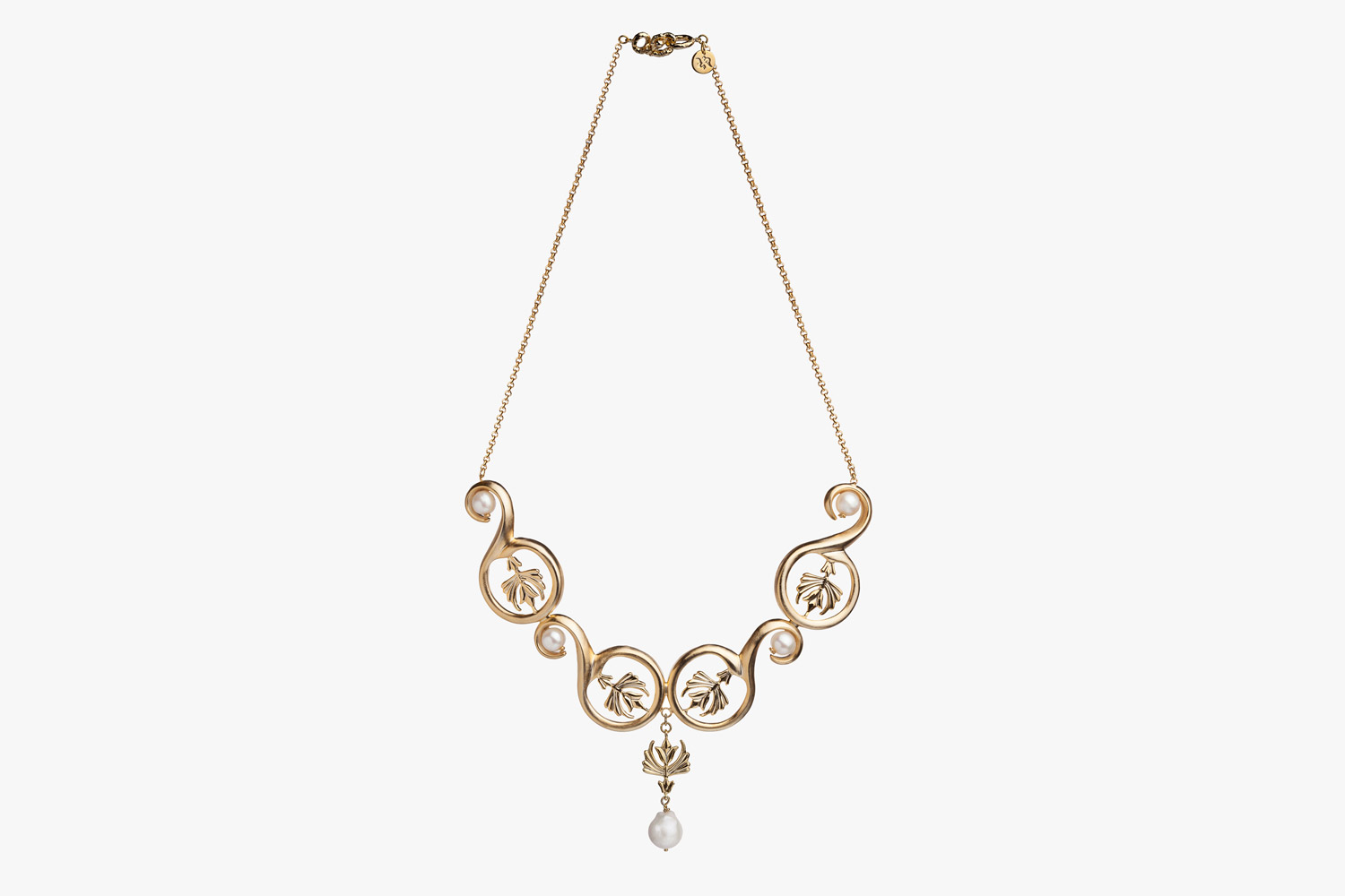 Exclusive necklace made of plated gold and pearls, entirely designed and handcrafted in Italy by Roberta Risolo with the lost wax micro casting technique. The “Giglio” (Italian for Lily) is a decoration of the left portal of the S. Caterina d'Alessandria Basilica in Galatina, one of the few examples of gothic art in Apulia. It's also represented on the coat of arms of the Angiò family.