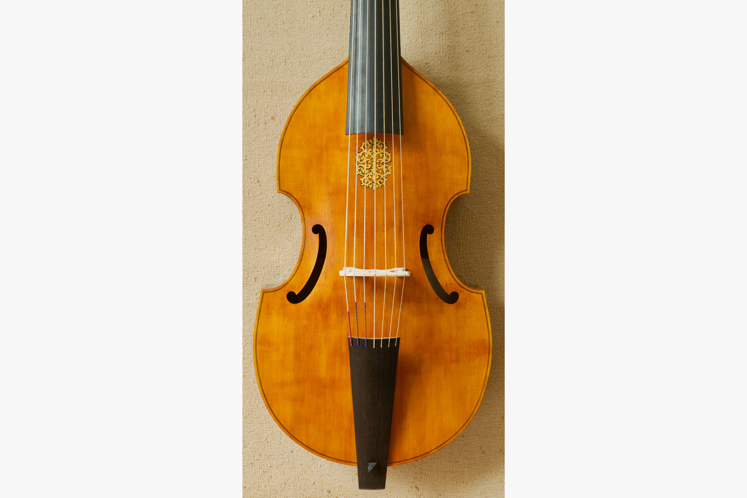 This bass viol is based on an original 17th century model by French maker Michel Colichon. From the knowledge available, he probably was the luthier who added a seventh string. In doing so, what we refer today as a French viol would become an important instrument, deeply changing the music of that time. The head of this viol has been carved with a detailed head of a woman. The intricate gold painting on the front is the only subtle decoration which enhances the visual aspect of the instrument.