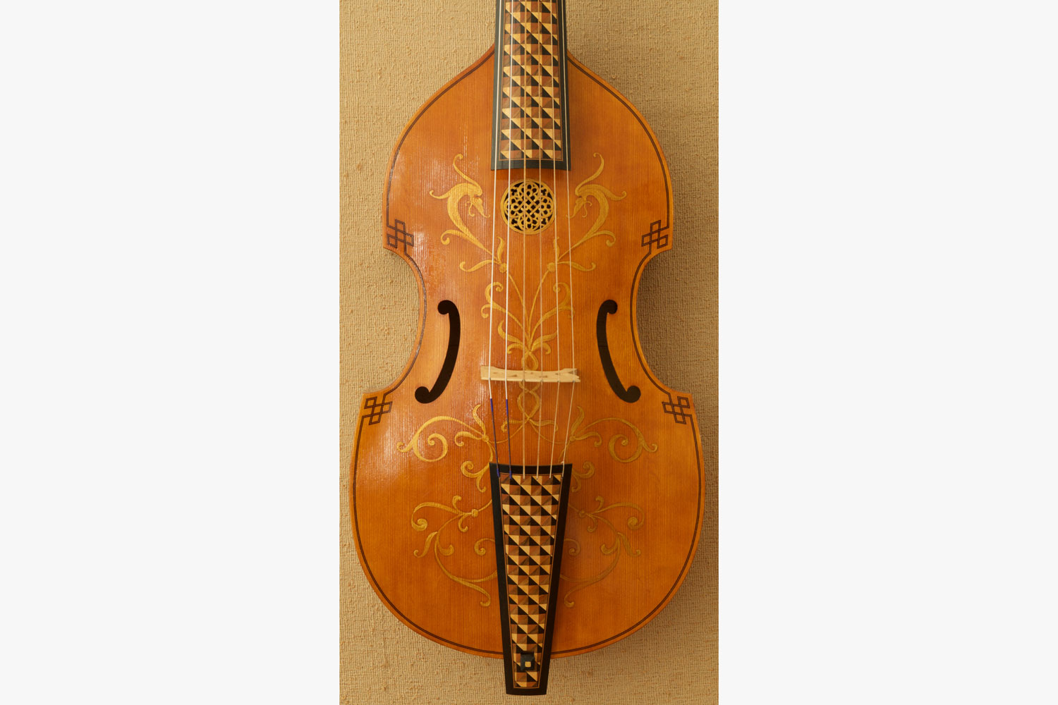 This six-string viol is based on a early 17th century viol made by Henry Jaye. It features many techniques of decorations which were commonly found on the instruments of this period. The head is an intricate carving of a woman – the female version of a satyr – who's horns are made of bone and wear a gold painted vegetal crown. Fine relief carving on all side of the pegbox and neck root enhance the beauty of this unique instrument. The geometrical marquetry on the fingerboard and tailpiece contrast with renaissance curves of the gold-painted front. More geometrical purfling designs in the corner and on the back of the instrument, typical of the viols of this era make it a truly unique viol.