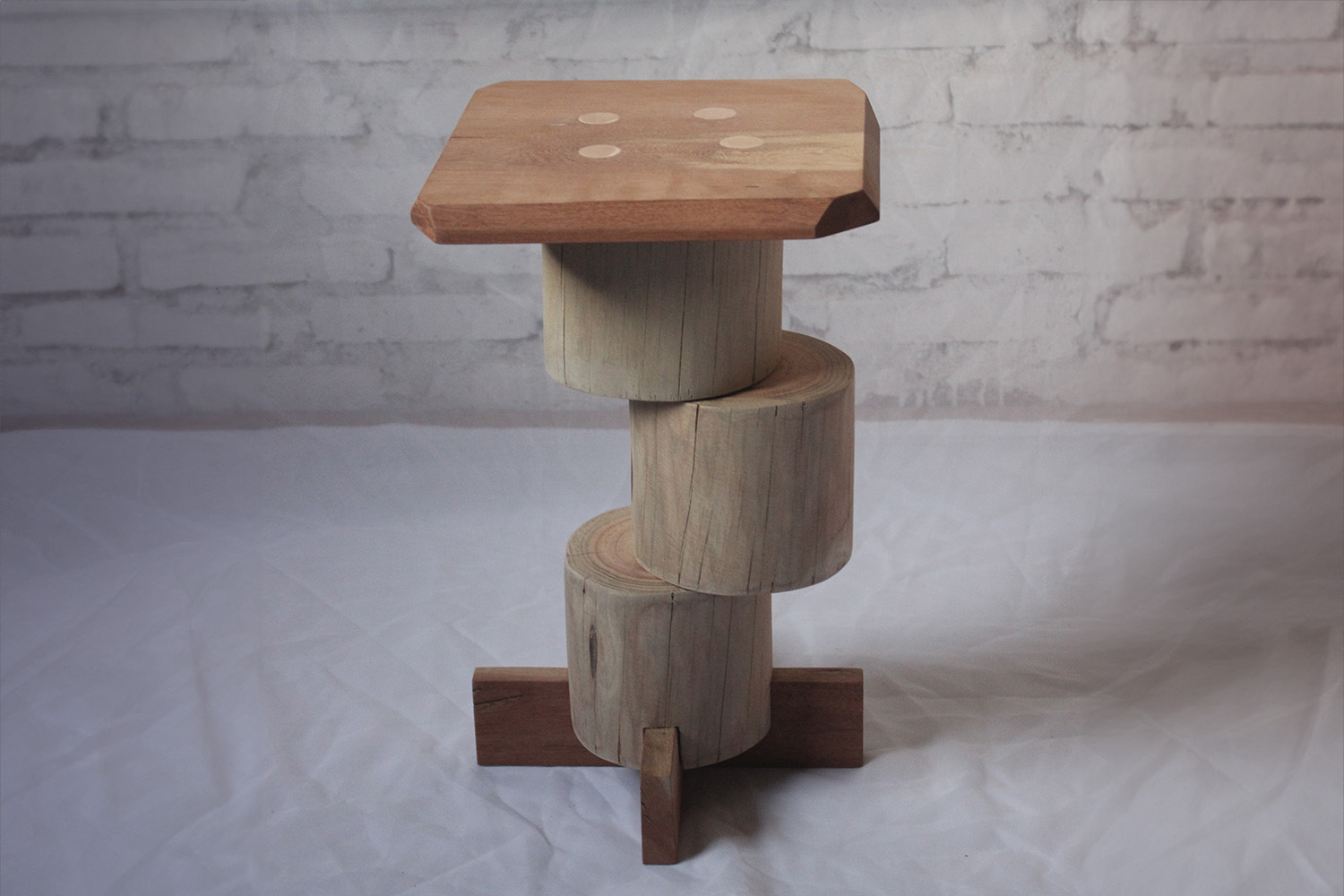 The Engrenagens stool has a visually provocative look with a gear shape in the centre and offset natural trunks. It is a unique, functional and decorative piece composed of two different types of wood – recycled timber wood for the seat and foot, and raw unpolished wood for the base.