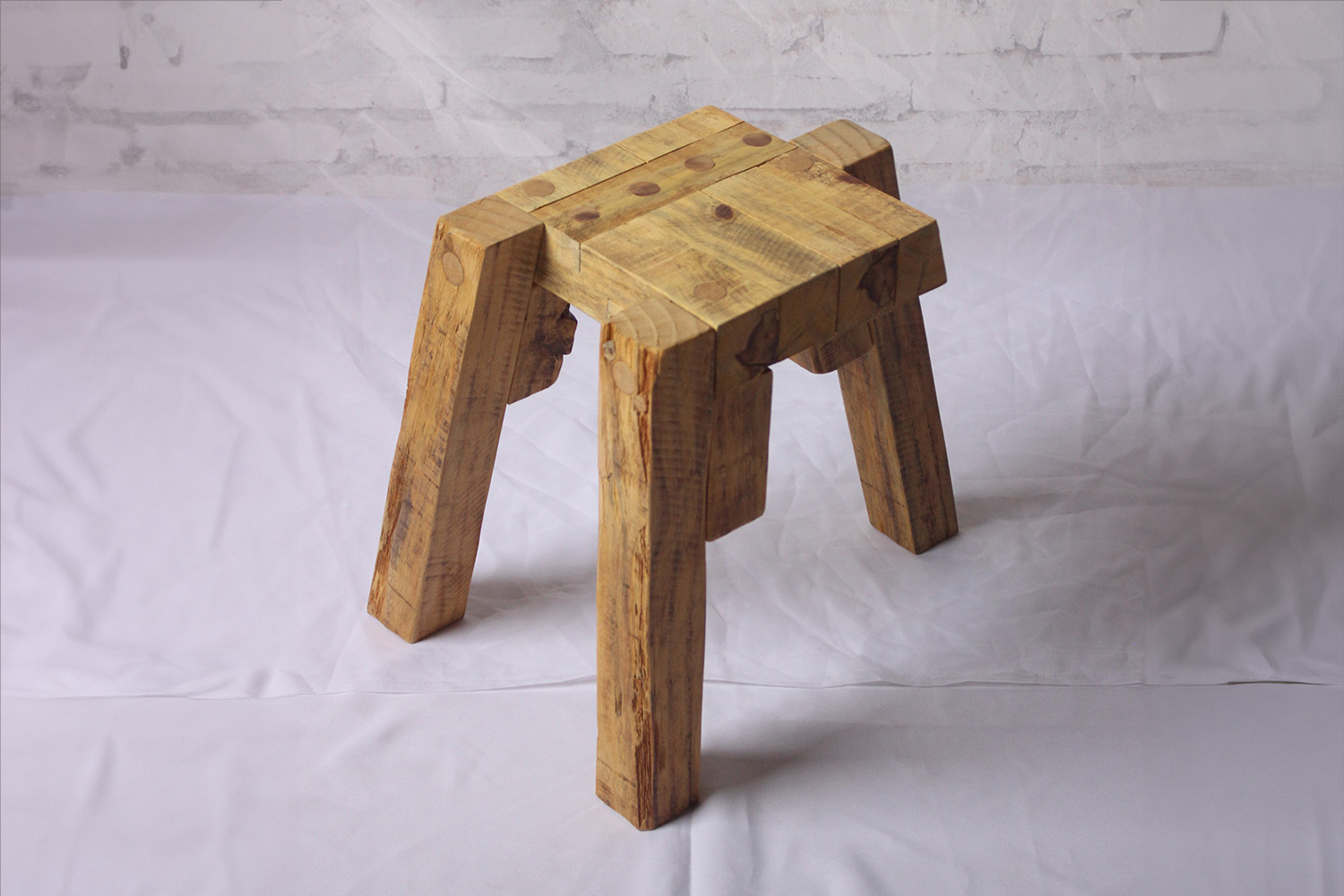The Levante stool is entirely built with pieces of recycled wood acquired from demolition. The geometrical composition of entirely light brown blocks results in a stool with three off-centre feet. It is a very stable and unique piece.