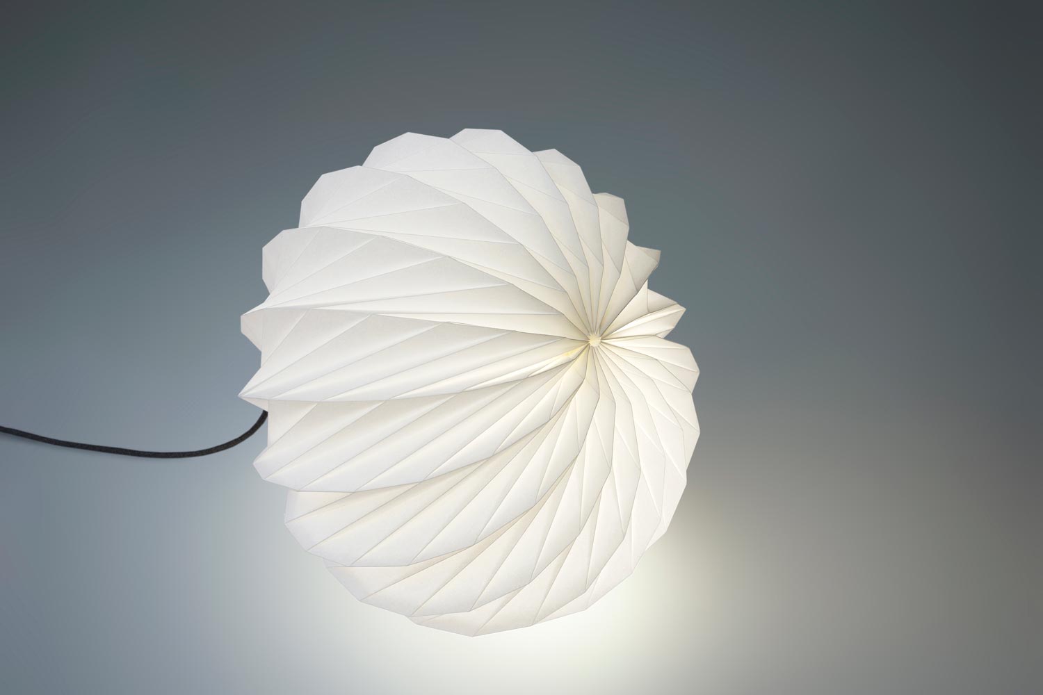 Onni is a lampshade made from white paper. Traditional origami folding techniques are used to create the three-dimensional object from two-dimensional paper. The flattened spherical shape is reminiscent of a sea urchin.