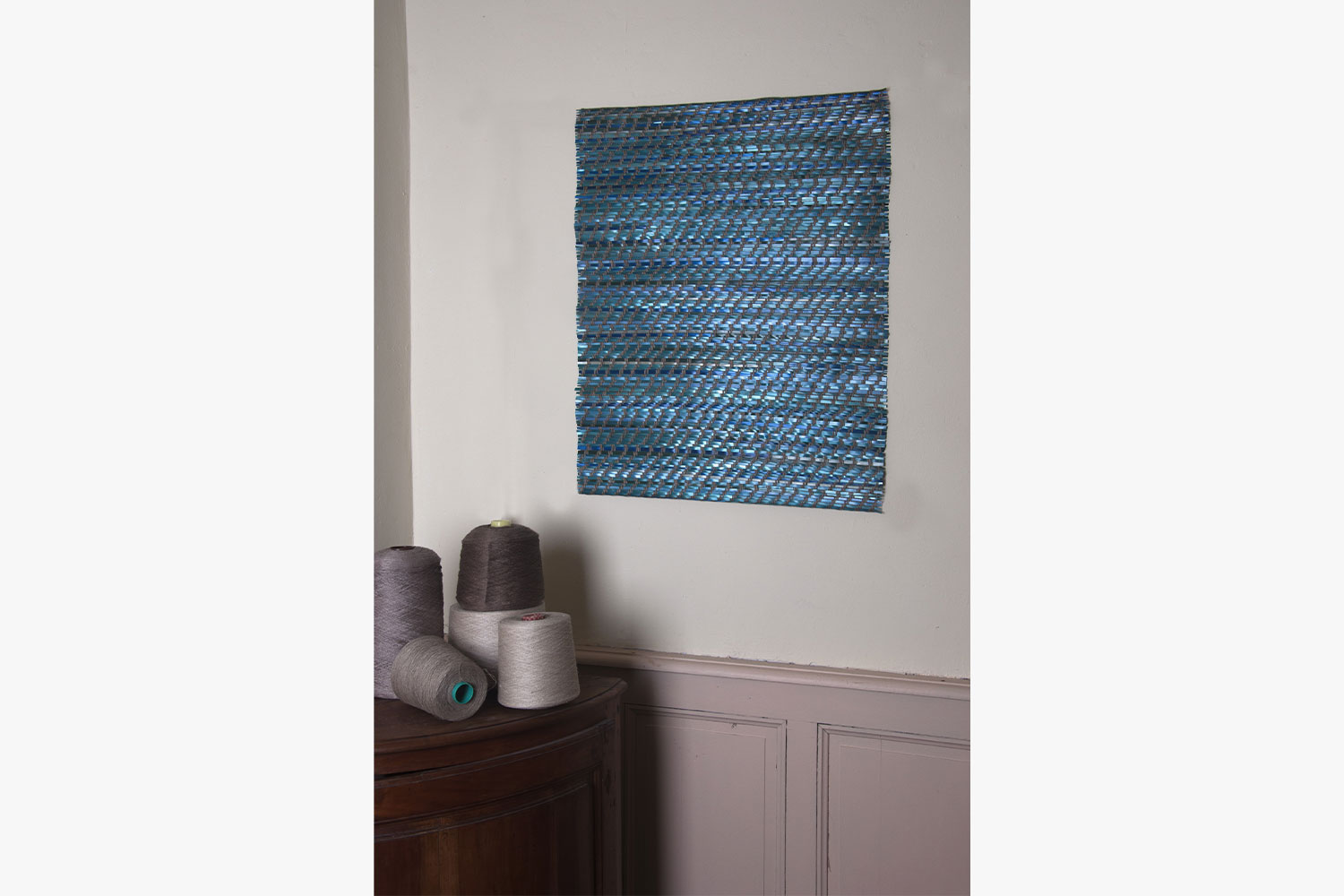 Wall weaving made on a hand loom. Natural linen yarns are woven with rye straw dyed in several shades of blue.