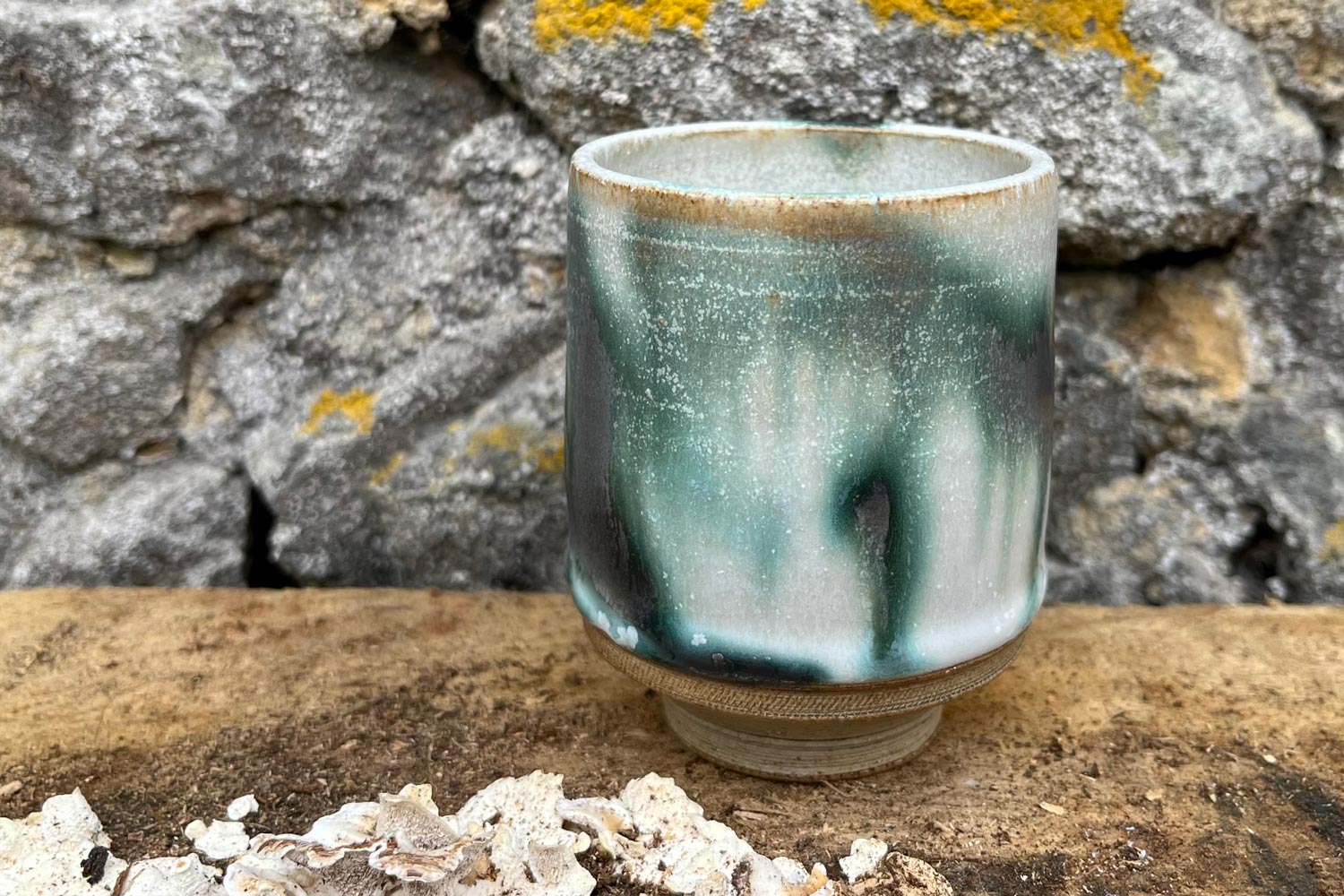 This red sandstone goblet was made on a potter's wheel by Sylvain Lequenne. The outer walls, mostly made of raw earth, are decorated with tools collected here and there, over time, but also with the resources offered by nature. Sylvain concocts and applies his enamels in an instinctive way, thus offering many variations of colours and textures.