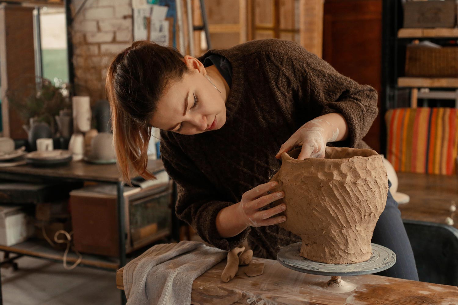 This pottery bowl with a large opening and a small base, can be used as a tea cup. It is covered with accentuated craquelure and the main colour is ivory.