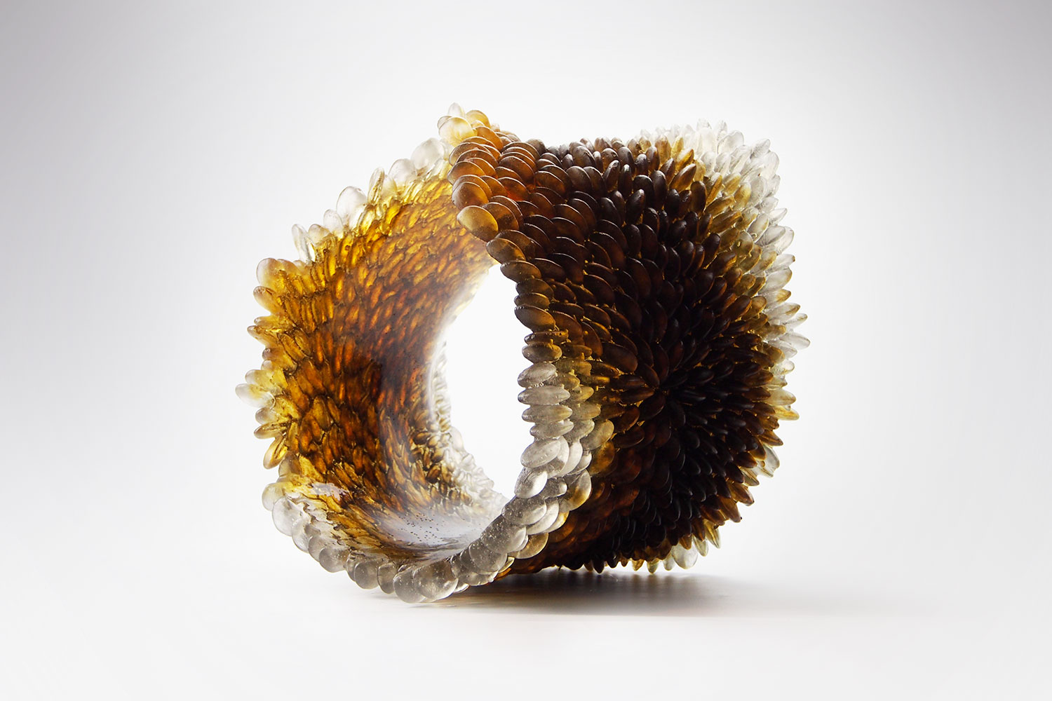 This brown and light grey crystal glass sculpture, made of kiln-cast glass, is shaped hot by hand from the open kiln and engraved.