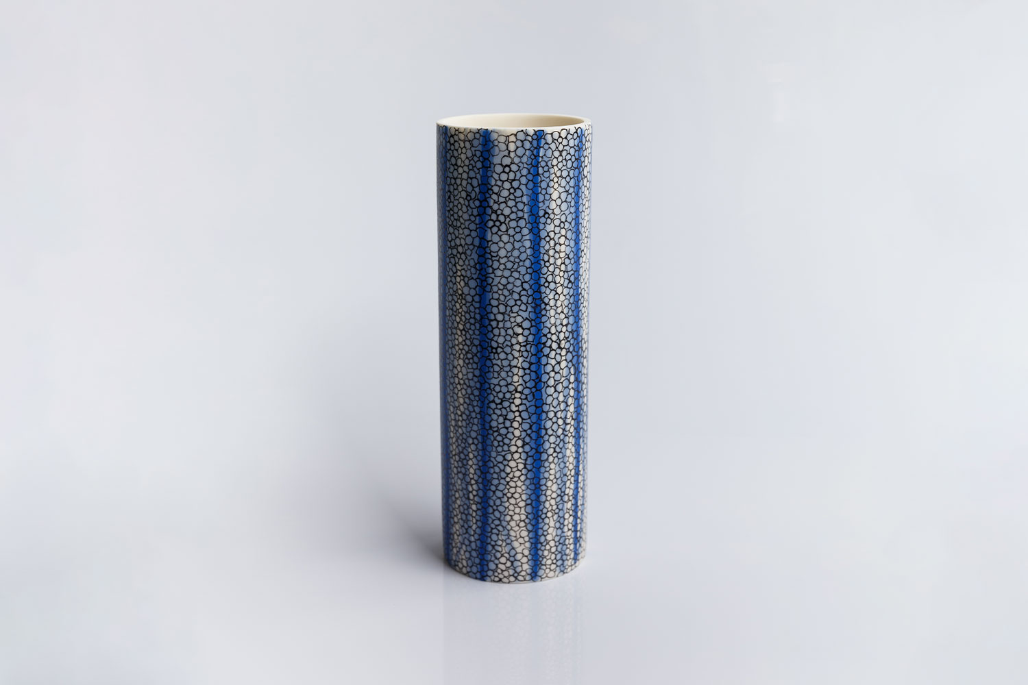 This cylinder vase is named after the Forget-me-not flower, "Non ti scordar di me", it is cast with Parian porcelain slip. The slip had been previously injected into the mould with blue stained clay in various decreasing tonalities and eventually hand decorated with underglaze pens. It has had two firings.