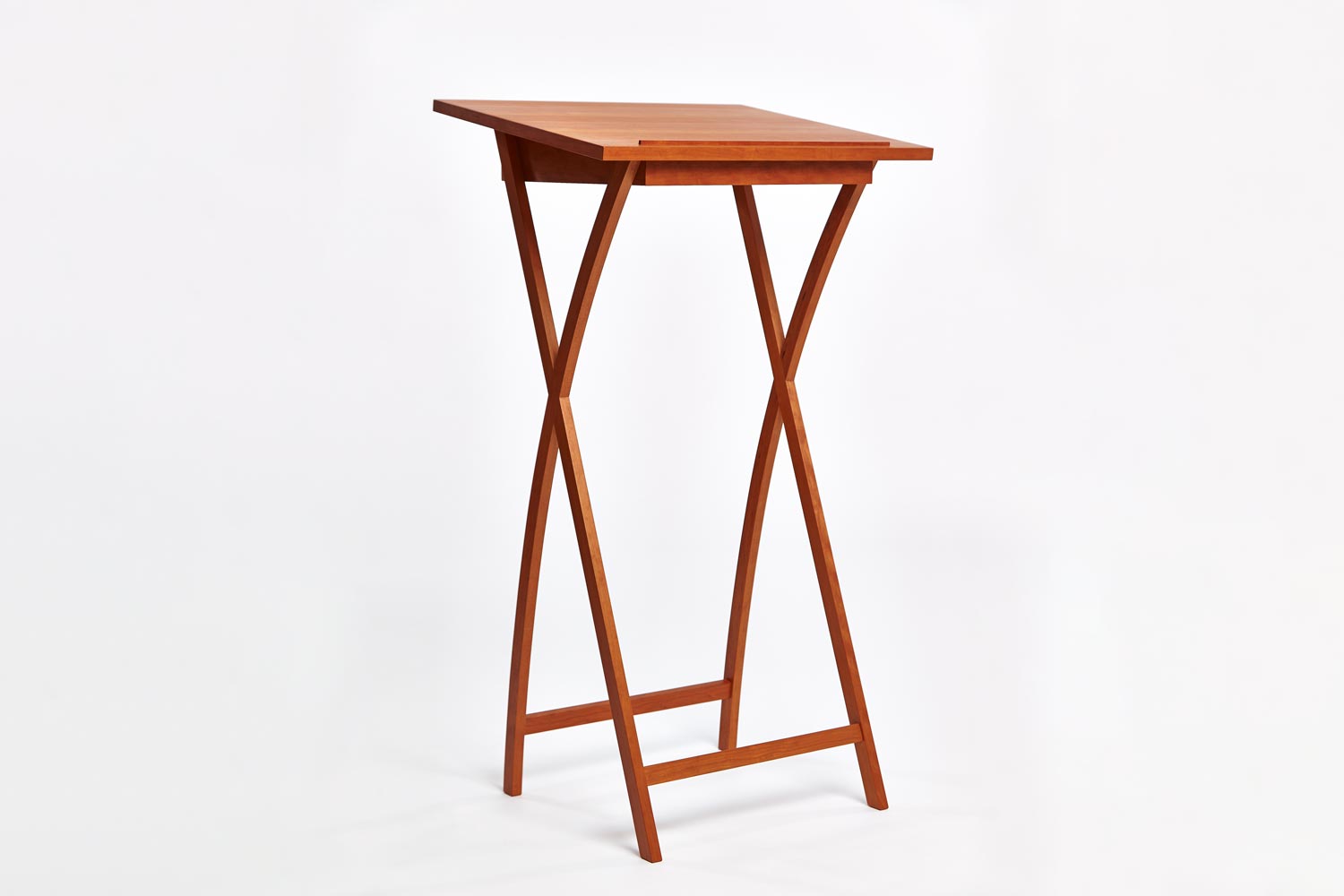 This standing desk is made of reddish cherrywood. It impresses with its lightness. The thin hind legs are slightly curved and crossed with the front legs. The curved legs are glued in layers and the curve visually supports the inclination of the writing surface which can be folded up.