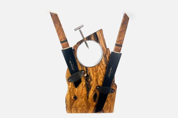 This hand forged kitchen knife is made from high carbon steel with a handle crafted from a natural wood.