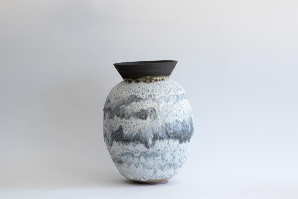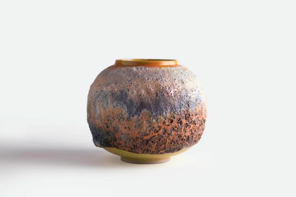 This wheel thrown and decorated jar is made out of stoneware clay with multiple coloured slips, oxides and volcanic glazes. The piece was fired at 1290 degrees Celsius with multiple firings.