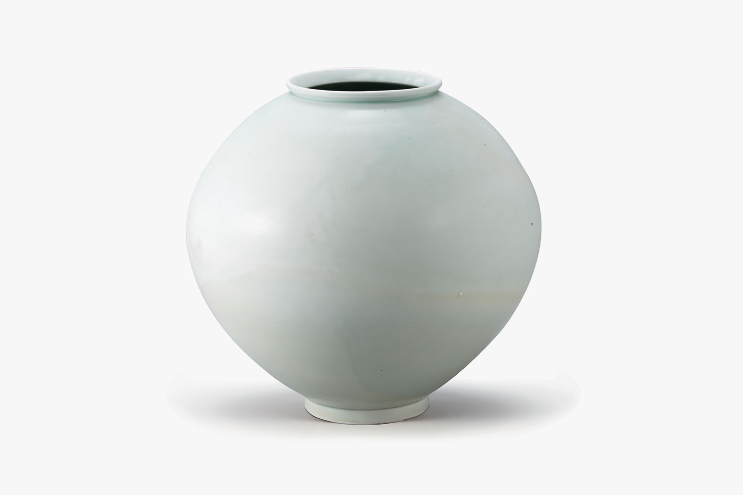 This is a moon jar made from Kaolin. Two semi-circles, formed on a traditional potter's wheel, have been joined together, resulting in a moon-shaped asymmetrical circle. It is white with subtle shades of blue, yellow and green from soil trace minerals, heated at a high temperature of 1350°C.