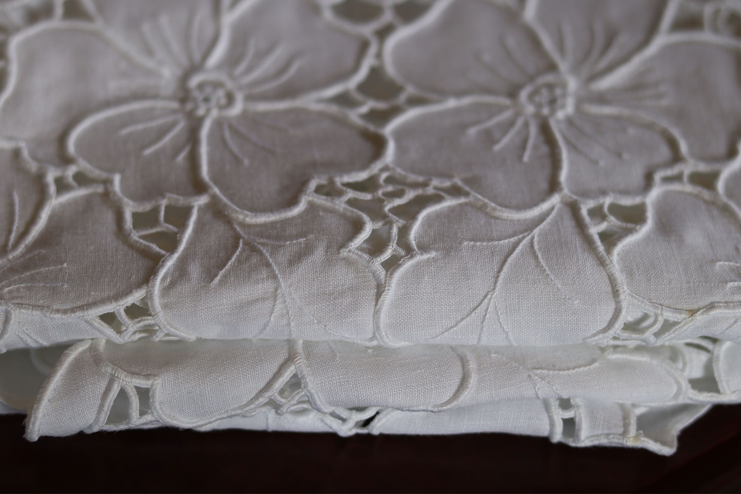 This piece, finely embroidered in cotton thread, was traditionally placed on small tables during the Christmas period as a decoration under the image of Jesus or other saints. It was also used as a centrepiece to decorate other furniture in the house.