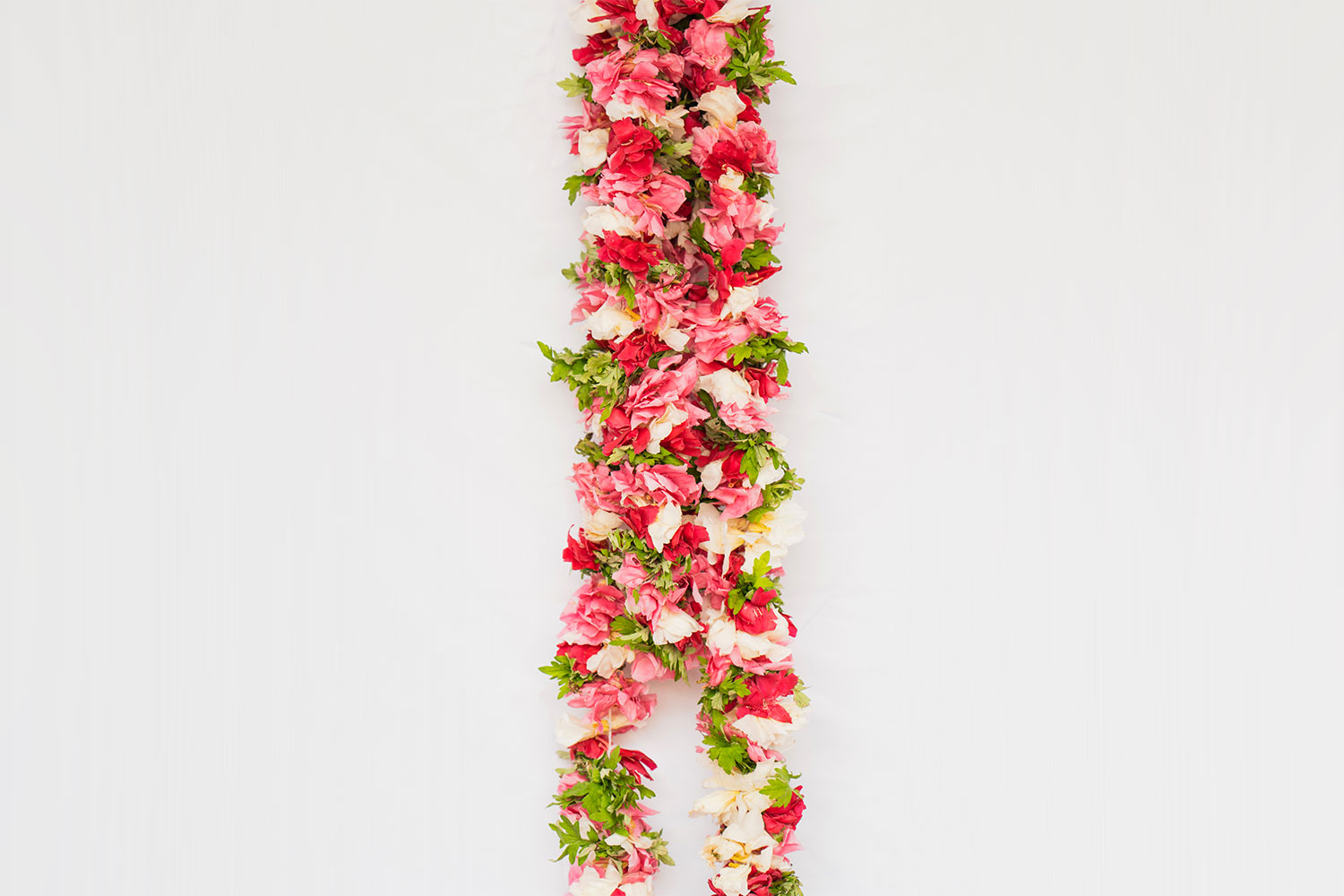 This pink, green and white flower ball serves as an alternative to fresh flower garlands. Typically, it takes about 20 minutes to complete the flower ball which is made with bud from nerium oleander flowers in three colours (dark pink, light pink and white) along with flashes of green.