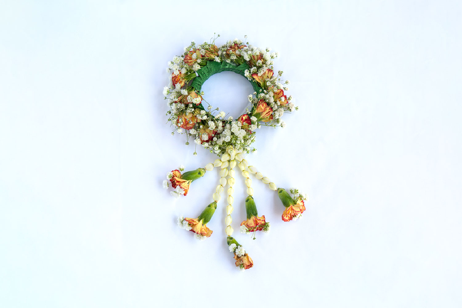 Fixed on a hard bangle which is made of bangle wrapped with green tape, the fresh flowers (orange carnations, crepe jasmine and white gysophilia) are used as bracelet for brides during their wedding walk-in. The lower part has five tassels of jasmine and carnations.