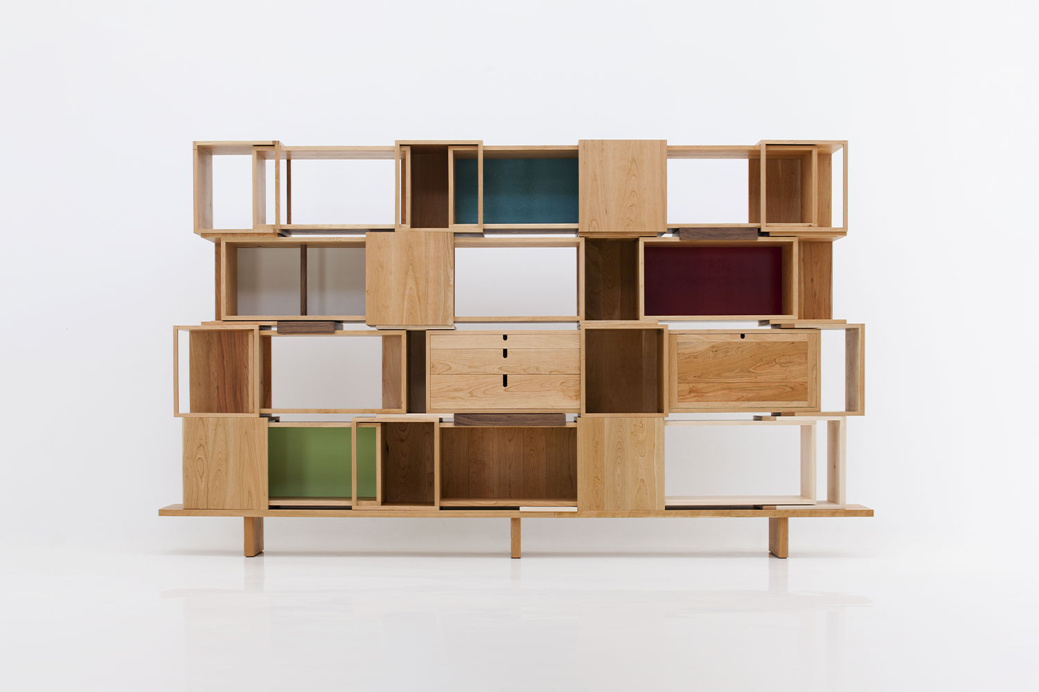 This is a cabinet made of cherry, maple and walnut wood with aluminium. It functions as a partition of space with its vertical and horizontal lines. The shelves can be transformed into the user's choice as it can be expanded and contracted up and down. The back board is aluminium anodised in 4 colours (green, brown, dark brown and blue green).